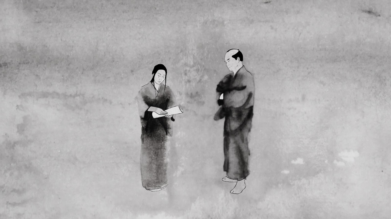 These two worlds represent the tension between duty and love, the former rendered as defined and precise, the latter as an almost ungraspable force. These worlds are framed by a contemporary prologue and epilogue. Filmed in live action, this third world makes a direct connection between Tamagata’s time and our own. The historical distancing serves to highlight the universal relevance of the tale.